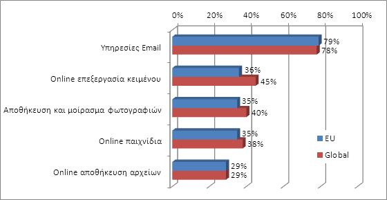 Οι πιο διαδεδομένες εφαρμογές cloud στην Ευρώπη είναι: το email (79%), η online επεξεργασία κειμένων (36%), η αποθήκευση εικόνων και τα online παιχνίδια (από 35%).