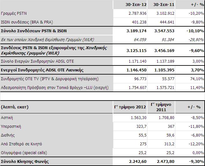 Το Γ’ τρίμηνο του 2012, οι συνδρομητές λιανικής ADSL του ΟΤΕ αυξήθηκαν κατά 34.100 ή κατά περίπου 60% των συνολικών καθαρών νέων συνδέσεων στην ελληνική αγορά, φθάνοντας τα 1.146 εκατομμύρια. Η έγκριση από την Ρυθμιστική Αρχή χαμηλότερων τιμολογιακών προγραμμάτων τον περασμένο Μάιο μείωσε κάπως το ανταγωνιστικό μειονέκτημα του ΟΤΕ σε σχέση με τους εναλλακτικούς παρόχους. Έτσι, ο ΟΤΕ συνέβαλε θετικά στη συνολική αύξηση της ευρυζωνικής αγοράς της χώρας, η οποία ανέκαμψε το Β’ τρίμηνο του 2012 και συνέχισε να αυξάνεται το Γ’ τρίμηνο του 2012, παρά το αρνητικό οικονομικό κλίμα.Το Γ’ τρίμηνο του 2012, η καθαρή απώλεια γραμμών στις δραστηριότητες του ΟΤΕ στη σταθερή τηλεφωνία Ελλάδας ανήλθε σε περίπου 54.900 PSTN και ISDN γραμμές λιανικής, σημειώνοντας συνεχή βελτίωση σε σύγκριση με την τάση προηγούμενων τριμήνων (Β’ τρίμηνο 2012: -75.000, Α’ τρίμηνο 2012: -94.000, Δ’ τρίμηνο 2011: -107.000, Γ’ τρίμηνο 2011: -99.000). Η συνολική αγορά στην Ελλάδα (ενεργοί συνδρομητές λιανικής ΟΤΕ, χονδρική εκμίσθωση γραμμών και συνδρομητές πλήρους Αδεσμοποίητης Πρόσβασης στον Τοπικό Βρόχο) έχασε 51.500 γραμμές το Γ’ τρίμηνο του 2012 (σε σύγκριση με τις 49.100 απώλειες το Γ’ τρίμηνο του 2011), ενώ οι εναλλακτικοί πάροχοι πρόσθεσαν μόνο 3.500 νέες γραμμές το Γ’ τρίμηνο του 2012, σε σύγκριση με την καθαρή αύξηση των 49.900 γραμμών το Γ’ τρίμηνο του 2011.