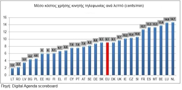 Πάντως, να σημειώσουμε ότι στη χώρα μας το εξεταζόμενο τιμολόγιο είναι αρκετά χαμηλότερο από το μέσο ευρωπαϊκό όρο (6,7 ευρωλεπτά το λεπτό έναντι μέσου ευρωπαϊκού όρου 9,1 ευρωλεπτά το λεπτό).