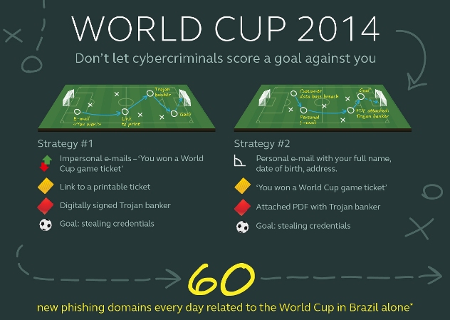 Καθώς η Βραζιλία προετοιμάζεται να φιλοξενήσει το Παγκόσμιο Κύπελλο Ποδοσφαίρου 2014 της FIFA, το οποίο θα ξεκινήσει στις 12 Ιουνίου, οι ψηφιακοί εγκληματίες «στήνουν» τις εκστρατείες τους με στόχο την εξαπάτηση των φιλάθλων.