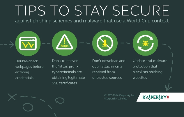 Ακολουθούν μερικές χρήσιμες συμβουλές για την προστασία των χρηστών από επιθέσεις phishing και κακόβουλου λογισμικού που αντλούν τη θεματολογία τους από Παγκόσμιο Κύπελλο: