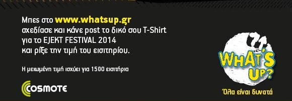 Το WHAT’S UP δίνει την ευκαιρία στους λάτρεις του Ejekt Festivalνα μειώσουν την τιμή του εισιτηρίου. Το μόνο που έχουν να κάνουν είναι να μπουν στο www.whatsup.gr, έως και τις 6 Ιουνίου, να δημιουργήσουν το δικό τους Τ- shirt, και να το κάνουν share στο Facebook. Έτσι, θα μπορέσουν να απολαύσουν το μοναδικό αυτό μουσικό event με μειωμένο εισιτήριο, ενώ 100 τυχεροί θα κερδίσουν, κατόπιν κλήρωσης, το μπλουζάκι που σχεδίασαν.