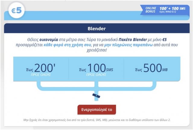 Κάθε φορά που χρησιμοποιείται το διαθέσιμο υπόλοιπο σε λεπτά, μειώνεται αντίστοιχα και το υπόλοιπο σε SMS ή ΜΒ και αντίστροφα, αφού ο συνδρομητής έχει στη διάθεση του ένα πακέτο με το οποίο μπορεί να κάνει κλήσεις προς όλους, να στέλνει SMS ή να σερφάρει μέσω του κινητού του χωρίς να χρειάζεται να πληρώνει τίποτα περισσότερο από 5 ευρώ και για τα 3 είδη χρήσης μαζί. Το πακέτο Blender συνοδεύεται και από Online Bonus 100 λεπτά +100 SMS προς Wind/Q.
