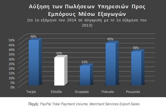 Οι πληρωμές από το εξωτερικό μέσω PayPal που έλαβαν οι Έλληνες έμποροι αυξήθηκαν κατά 30% το πρώτο εξάμηνο του 2014, σε σύγκριση με το αντίστοιχο διάστημα του 2013. Οι βασικές κατηγορίες εξαγωγών περιλάμβαναν ταξιδιωτικές υπηρεσίες, υπηρεσίες διαδικτύου, είδη μόδας και οικιακής χρήσης, εξαρτήματα αυτοκινήτων, βιβλία, λογισμικά και κινητά τηλέφωνα. Το 2014, πάνω από 10.000 ενεργοί έμποροι στην Κεντρο-Ανατολική Ευρώπη σύναψαν συνεργασία με την PayPal, προκειμένου να επεκτείνουν τις επιχειρήσεις τους διεθνώς.