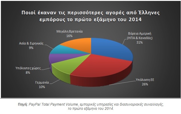 Οι Έλληνες έμποροι δέχονται παραγγελίες κυρίως από καταναλωτές από την Ευρώπη, περιλαμβανομένων του Ηνωμένου Βασιλείου (16%) και της Γερμανίας (10%), η Βόρεια Αμερική όμως παραμένει ως μια βασική αγορά που στέλνει χρήματα online στην Ελλάδα (31%). Ενδιαφέρον έχει το γεγονός ότι ο καταμερισμός των βασικών αγορών που οφείλονται για την εντυπωσιακή αύξηση στην αξία των ελληνικών εξαγωγών έχει παραμείνει σχεδόν ο ίδιος τα τελευταία έτη.