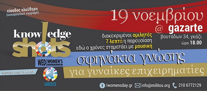Λίγο μετά τις 18:00 το απόγευμα, στο επιτυχημένο μοντέλο μετάδοσης γνώσης knowledge shots©, 11 επιφανείς προσωπικότητες θα μοιραστούν – μέσα σε μόλις 7 λεπτά ο καθένας/καθεμία – πρακτικές συμβουλές, τεχνογνωσία και εμπειρίες, χρήσιμες για γυναίκες που ονειρεύονται να ξεκινήσουν ή να βελτιώσουν την επιχείρησή τους.