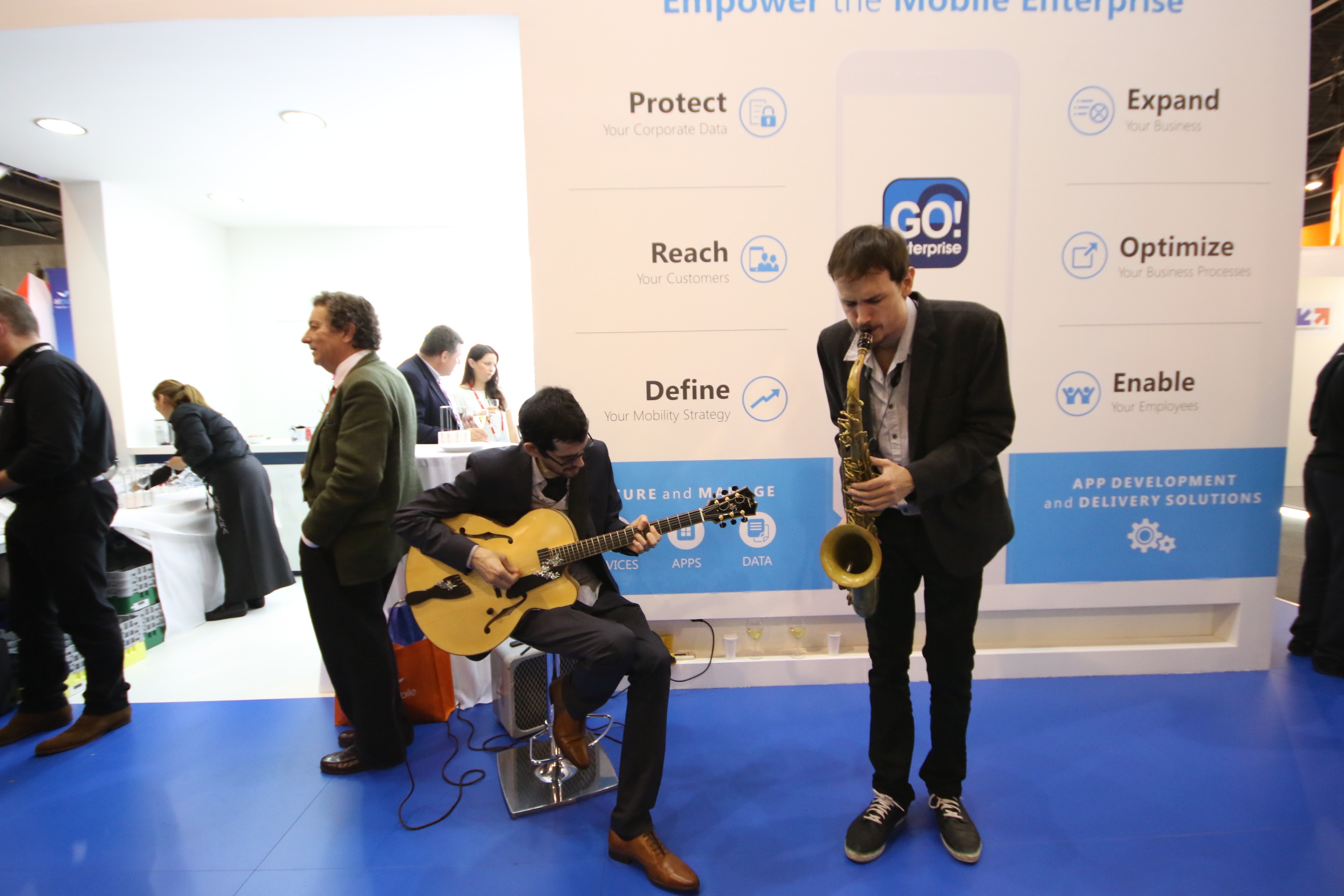 Σε κεντρικότατο σημείο του περίφημου Hall 8.1 με την έντονη ελληνική παρουσία, δεκάδες επισκέπτες, mobility experts, εκπρόσωποι ελληνικών και ξένων επιχειρήσεων αλλά και του Τύπου, συγκεντρώθηκαν προς το τέλος της 2ης ημέρας του MWC 2015, ώστε να χαλαρώσουν και να ανταλλάξουν απόψεις περί των όσων έγιναν και ειπώθηκαν μέχρι τώρα στην έκθεση, απολαμβάνοντας το ποτό τους συνοδεία live jazz μουσικής.