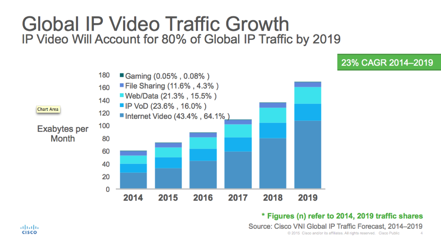 Η Cisco προβλέπει πως η παγκόσμια διακίνηση δεδομένων μέσω IP θα φτάσει τα 168 exabytes/μήνα μέχρι το 2019, αυξημένη σε σχέση με τα 59.9 exabytes/μήνα το 2014. Το 2019 η διακίνηση δεδομένων μέσω δικτύων IP παγκοσμίως θα είναι όση όλα τα προηγούμενα «χρόνια Internet» μαζί (από το 1984 μέχρι το τέλος του 2013). Πολλά στοιχεία θα διαμορφώσουν τη Διακίνηση Δεδομένων μέσω IP μέσα στα επόμενα χρόνια: