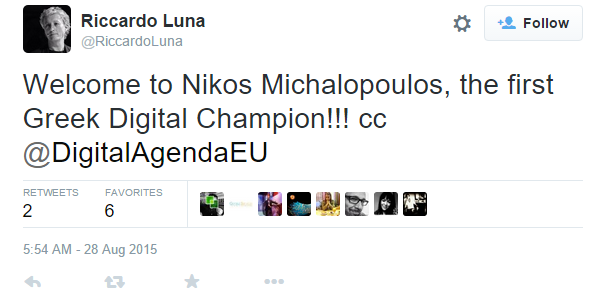 Παραθέτουμε το tweet με το οποίο ο Ιταλός Digital Champion καλωσορίζει τον νέο Έλληνα ομόλογό του :