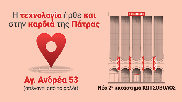 Η Πάτρα αποκτά το νέο προορισμό τεχνολογίας: το νέο κατάστημα Κωτσόβολος στην οδό Αγίου Ανδρέα 53. Στην καρδιά της πόλης, το κατάστημα της Κωτσόβολος αλλάζει τα δεδομένα στον κλάδο των ηλεκτρονικών και ηλεκτρικών ειδών, προσφέροντας στο κοινό 3 ορόφους με τα πιο προηγμένα προϊόντα της αγοράς που καλύπτουν πλήρως τις ανάγκες ακόμα και των πιο απαιτητικών καταναλωτών. Το νέο αυτό κατάστημα αποτελεί το δεύτερο της εταιρείας στην πόλη της Πάτρας και το τρίτο στο νομό Αχαΐας.