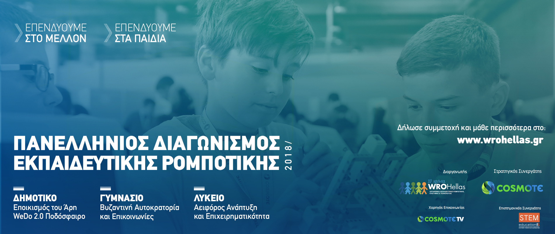 Η Cosmote, εδώ και 4 χρόνια, ως στρατηγικός συνεργάτης του Μη Κερδοσκοπικού Οργανισμού Εκπαιδευτικής Ρομποτικής, Επιστήμης και Τεχνολογίας, WRO Hellas, υλοποιεί ένα σύνολο δράσεων, με σκοπό τη διάδοση της εκπαιδευτικής μεθόδου STEM (Science–Technology-Engineering–Mathematics) στο ελληνικό εκπαιδευτικό σύστημα. Η εκπαιδευτική ρομποτική βασίζεται στην μέθοδο S.T.E.M, καθώς συνδυάζοντας την επιστήμη, τα μαθηματικά, την μηχανική και την τεχνολογία για τη δημιουργία μιας ρομποτικής κατασκευής, βοηθά τα παιδιά να αποκτήσουν νέες δεξιότητες, αλλά και να αναπτυχθεί η ομαδικότητα, η φαντασία και η δημιουργικότητά τους.