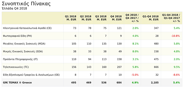 Οι κατηγορίες προϊόντων που σημείωσαν τις περισσότερες πωλήσεις το 2018, σύμφωνα με την GFK, ήταν τα ηχεία, οι κονσόλες και οι τηλεοράσεις. Στις μεγάλες οικιακές συσκευές ανοδικά κινήθηκαν οι κουζίνες και οι συσκευές μεγαλύτερης χωρητικότητας όπως ψυγειοκαταψύκτες. Στα είδη πληροφορικής οι οθόνες, τα gaming and leisure devices, οι φορητοί υπολογιστές και τα περιφερειακά κατέγραψαν ανοδικές πωλήσεις.