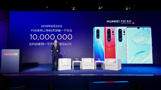 Στις 27 Ιουνίου 2019, στο Mobile World Congress (MWC) – Global Device Summit στη Σανγκάη, ο Kevin Ho, πρόεδρος του τμήματος Συσκευών Κινητής Τηλεφωνίας του Huawei, Consumer Business Group δήλωσε: «Οι πωλήσεις smartphones της Huawei για φέτος έφτασαν τις 100 εκατομμύρια μονάδες μόλις στις 30 Μαΐου, αρκετά νωρίτερα από τον χρόνο που χρειάστηκε για τις ίδιες πωλήσεις πέρυσι, το 2018. Ο όγκος των πωλήσεων της σειράς HUAWEI P30, έφτασε τις 10 εκ. μονάδες μέσα στις πρώτες 85 μέρες μετά το λανσάρισμα! Ο χρόνος που χρειαστήκαμε για να φτάσουμε τις πωλήσεις των 10 εκ. τηλεφώνων, είναι κατά 62 ημέρες λιγότερος από τον αντίστοιχο χρόνο που πήρε η σειρά HUAWEI P20». Οι τρεις αυτοί μήνες, αποτελούν το νέο ρεκόρ πωλήσεων για τις ναυαρχίδες της Huawei.