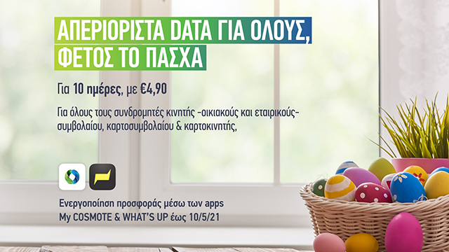 Απεριόριστα data για 10 ημέρες με €4,90, προσφέρει η Cosmote σε όλους τους συνδρομητές της φέτος το Πάσχα, φέρνοντας κοντά αγαπημένα πρόσωπα και συνεργάτες.