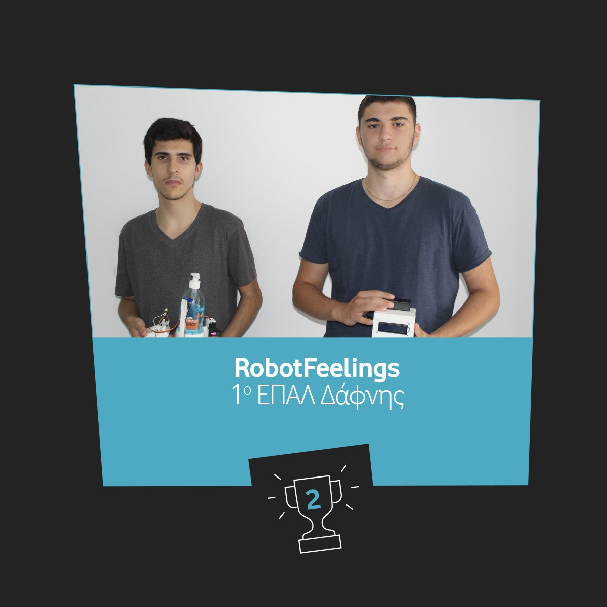 Στη δεύτερη θέση βρέθηκε η ομάδα “RobotFeelings’’ από το 1ο ΕΠΑΛ Δάφνης. Οι μαθητές Παύλος Ζάγκας και Καταλίν Πετράκε, με υπεύθυνο τον καθηγητή τους Αριστείδη Τσιατούχα, κατασκεύασαν έναν αυτόματο διανεμητή αντισηπτικού, ο οποίος χωρίς να χρειαστεί καμία άμεση επαφή, διανέμει την κατάλληλη ποσότητα αντισηπτικού στα χέρια μας.
