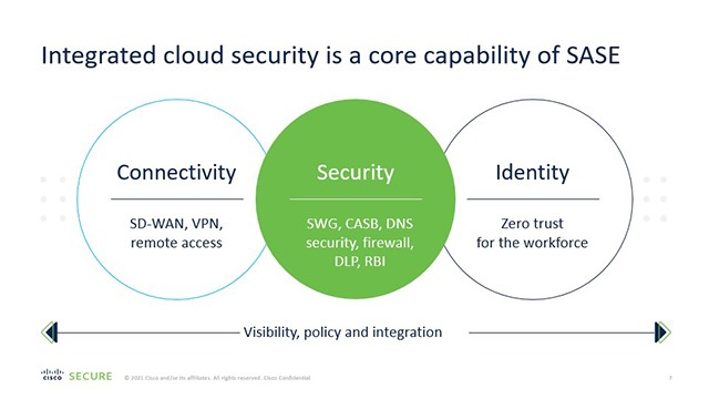 Η ασφάλεια είναι ο πυρήνας της Cisco SASE αρχιτεκτονικής και υλοποιείται με το Cisco Umbrella (Security). Τα άλλα δύο κύρια δομικά στοιχεία του SASE είναι το Cisco SD-WAN (Connectivity) και το Cisco DUO (Identity).