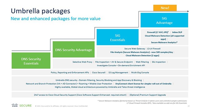 Υπάρχουν πλέον τέσσερα πακέτα του Cisco Umbrella, DNS Security Essentials, DNS Security Advantage, SIG Essentials, και το SIG Advantage. Το κάθε ένα από αυτά εμπεριέχει τις λειτουργίες του προηγούμενου και περιλαμβάνει επιπλέον χαρακτηριστικά.