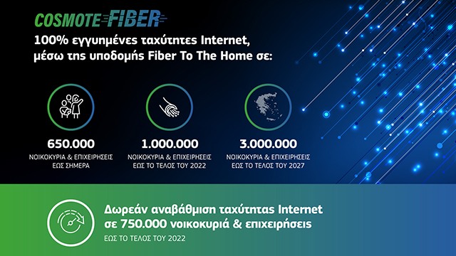 Βάσει επίσης στοιχείων του ΟΤΕ τα νοικοκυριά και οι επιχειρήσεις σε όλη την Ελλάδα που έχουν πρόσβαση σε οπτική ίνα μέχρι το σπίτι (FTTH) μέσω του Cosmote Fiber έφθασαν 650.000.