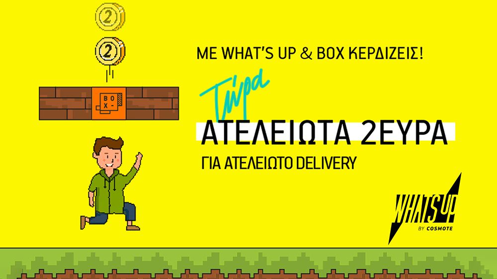 Mε χιλιάδες καταστήματα σε όλη την Ελλάδα, όπως μεγάλες αλυσίδες εστίασης, δημοφιλή brands και τοπικές επιχειρήσεις, οι χρήστες του WHAT’S UP θα βρουν στο BOX, την υπηρεσία online παραγγελίας φαγητού της COSMOTE, μια μεγάλη ποικιλία σε γεύσεις και κουζίνες για να παραγγείλουν αυτό που επιθυμούν. Η πλατφόρμα του ΒΟΧ εμπλουτίζεται συνεχώς με νέες περιοχές και νέες κατηγορίες προϊόντων. Παράλληλα, οι χρήστες του WHAT’S UP σε κάθε παραγγελία στο ΒΟΧ επωφελούνται διπλά: μπορούν να χρησιμοποιήσουν και την έκπτωση των 2€ και να κερδίζουν πόντους και GB στις παραγγελίες τους.