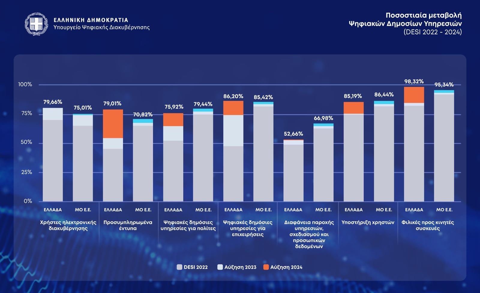 - Φιλικές προς κινητές συσκευές: Με ποσοστό 98.32% η Ελλάδα ξεπερνά τον Ευρωπαϊκό Μ.Ο του 95.3% σημειώνοντας αύξηση 13.6 ποσοστιαίων μονάδων. Μια πρόοδος που αντανακλά τη διαρκή δέσμευση του Υπουργείου Ψηφιακής Διακυβέρνησης για την υλοποίηση ψηφιακών υπηρεσιών που να είναι προσβάσιμες από το κινητό, διευκολύνοντας ουσιαστικά την καθημερινότητα των πολιτών και των επιχειρήσεων.