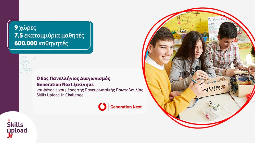 Ο 8ος Πανελλήνιος Διαγωνισμός Generation Next του Ιδρύματος Vodafone ξεκινά ανανεωμένος και προσκαλεί για πρώτη φορά μαθητές και μαθήτριες από όλη την Ελλάδα να γίνουν μέρος μιας μεγάλης ευρωπαϊκής κοινότητας, μέσω της πρωτοβουλίας Skills Upload Jr Challenge. Φέτος, όσοι λάβουν μέρος στον διαγωνισμό, θα έχουν τη δυνατότητα να αξιοποιήσουν τις γνώσεις τους σε νέες τεχνολογίες, τη φαντασία και τη δημιουργικότητά τους, ενώ παράλληλα, η 1η νικήτρια ομάδα θα έχει την ευκαιρία να γνωρίσει αντίστοιχες ομάδες με τα ίδια ενδιαφέροντα, από όλη την Ευρώπη.