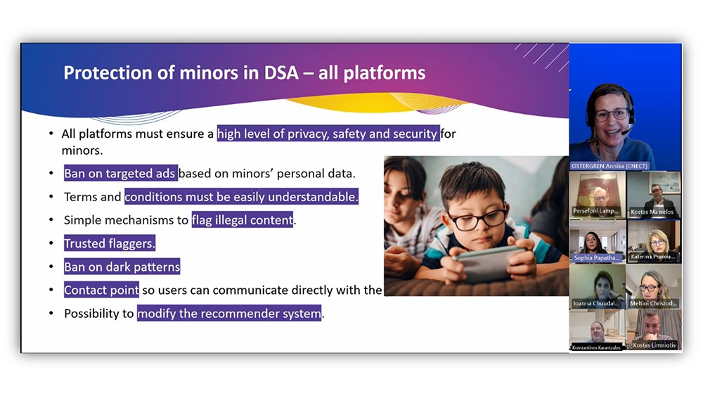 Όπως τονίστηκε από τον Καθ. Κωνσταντίνο Μασσέλο, η DSA αποσκοπεί στο να διασφαλίσει και να προστατεύσει τα δικαιώματα των χρηστών του διαδικτύου δίνοντας έμφαση τα παιδιά και τους νέους, ιδίως κατά της σεξουαλικής κακοποίησης καθώς αυξάνονται εκθετικά τα περιστατικά αυτά. Στόχος είναι η έγκαιρη ειδοποίηση των πλατφορμών προκειμένου να σταματήσει να διαδίδεται το παράνομο περιεχόμενο. Η κα Annika Ostergren τόνισε τη σημασία της DSA στην προστασία των ανηλίκων χρηστών του διαδικτύου σε επίπεδο Ευρώπης ενώ επεσήμανε ότι ήδη έχουν αρχίσει να πραγματοποιούνται οι πρώτοι έλεγχοι (audits) στις πιο δημοφιλείς επιγραμμικές πλατφόρμες και μηχανές αναζήτησης. Η κα Παπαθανασοπούλου έδωσε μεγάλη έμφαση στο σχεδιασμό των διαφόρων επιγραμμικών πλατφορών που είναι τέτοιος ώστε να αποσκοπεί στην κατάχρηση του διαδικτύου από τους ανηλίκους χρήστες και επεσήμανε ότι πρόκειται να συσταθεί μια ομάδα εργασίας ειδικά για την εξεύρεση τρόπων αντιμετώπισης του φαινομένου αυτού. Στη συνέχεια, η κα Πέρσα Λαμπροπούλου κατέδειξε το ρόλο του ΕΣΡ ως συντονιστή για την υλοποίηση της DSA στην Ελλάδα. Ιδιαίτερα σημαντική ήταν και η τοποθέτηση του κ. Λιμνιώτη από την Αρχή Προστασίας Δεδομένων, που εξήρε το ενδιαφέρον γύρω από τους τρόπους που υπάρχουν στις διάφορες διαδικτυακές πλατφόρμες για την επαλήθευση ηλικίας (age verification systems). Είναι ένα δύσκολο και απαιτητικό εγχείρημα για το οποίο όμως γίνονται προσπάθειες σε Ευρωπαϊκό επίπεδο. Το ενδιαφέρον κέντρισε και η άποψη της εκπροσώπου του πάνελ νέων του Ελληνικού Κέντρου Ασφαλούς Διαδικτύου η οποία τόνισε ότι, ως νέα, επιθυμεί μεγαλύτερη προστασία από τις επιγραμμικές πλατφόρμες όταν πλοηγείται σε αυτές καθώς επίσης ότι το ζητούμενο είναι να υπάρχει απλός και κατανοητός τρόπος για τους νέους για οτιδήποτε συμβαίνει με τα προσωπικά τους δεδομένα στο διαδίκτυο. Είπε χαρακτηριστικά: «Πολλές φορές είναι δύσκολο να μπούμε στη διαδικασία να καταγγείλουμε κάτι άσχημο που συναντήσαμε στο διαδίκτυο και τότε σταματάμε την προσπάθεια. Όταν πρέπει να διαβάσεις μεγάλα κείμενα για να προχωρήσεις τη διαδικασία, τότε τα παρατάς».