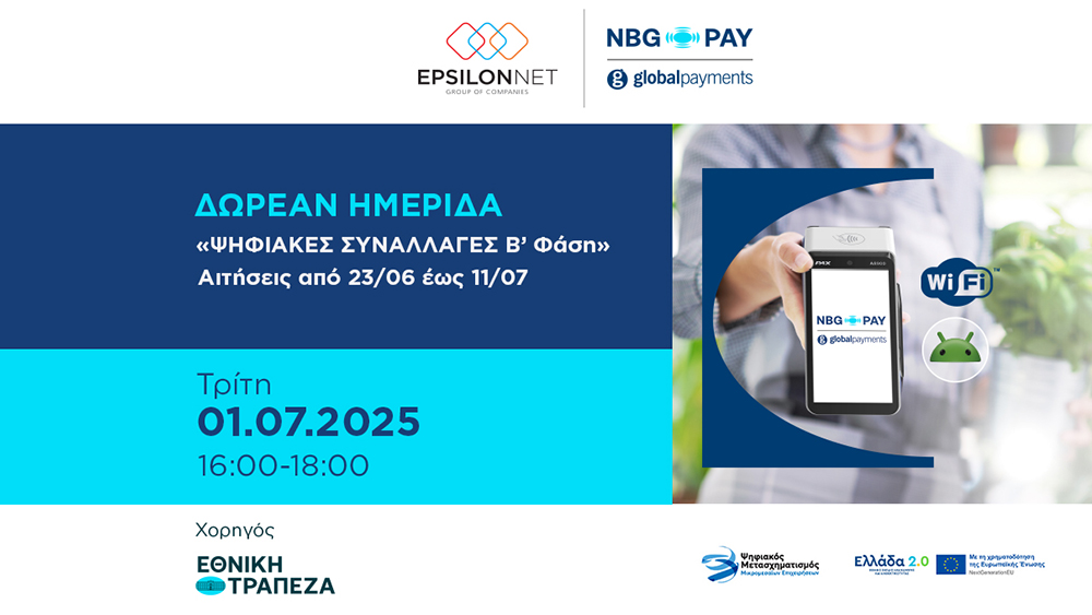 Χορηγός της σημαντικής αυτής πρωτοβουλίας είναι η ΕΘΝΙΚΗ ΤΡΑΠΕΖΑ. Δηλώστε δωρεάν συμμετοχή εδώ για να παρακολουθήσετε την Ημερίδα και ενημερωθείτε αναλυτικά για το Πρόγραμμα «Ψηφιακές Συναλλαγές Β’ Φάση».