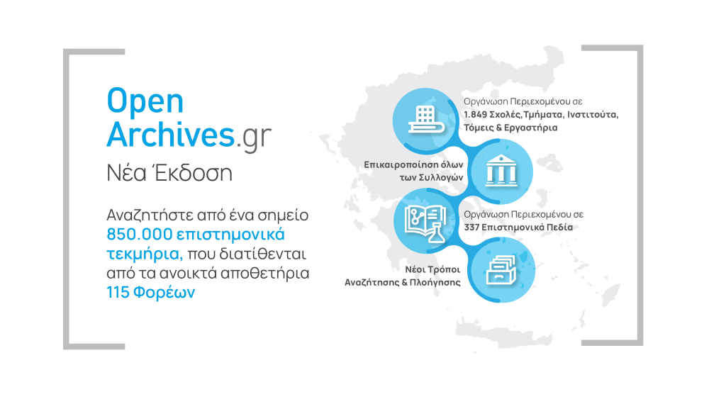 Η ανοικτή δημόσια πύλη του Εθνικού Κέντρου Τεκμηρίωσης και Ηλεκτρονικού Περιεχομένου (ΕΚΤ) για επιστημονικό, ερευνητικό και ακαδημαϊκό υλικό, ανανέωσε το περιεχόμενο που φιλοξενεί και τον τρόπο πλοήγησης σε αυτό, διευκολύνοντας ακόμα περισσότερο την πρόσβαση σε ένα μεγάλο πλήθος επιστημονικών συλλογών. Το OpenArchives.gr, που από το 2006 επιτρέπει την ενιαία αναζήτηση σε πλήθος ακαδημαϊκών και επιστημονικών αποθετηρίων, είναι μία από τις ψηφιακές υποδομές του ΕΚΤ για τη συλλογή, τεκμηρίωση και διάχυση της επιστημονικής γνώσης. Τα 850.000 επιστημονικά τεκμήρια των 141 ψηφιακών συλλογών που διαθέτουν οι 115 φορείς από όλη την Ελλάδα αποτελούν ένα πολύτιμο ψηφιακό απόθεμα, προσβάσιμο σε όλους.