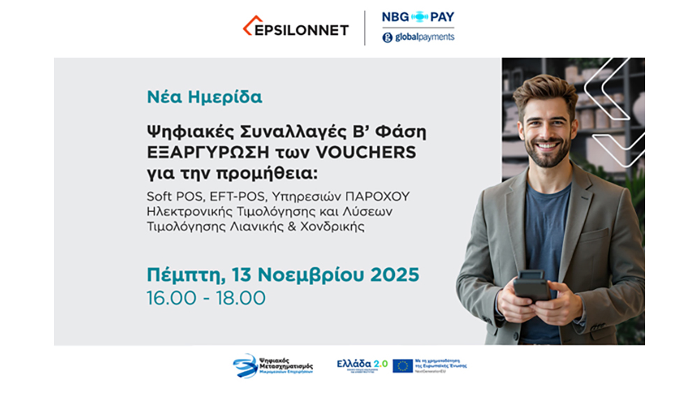 Η NBG Pay και ο Όμιλος EPSILONNET, με την υποστήριξη της Εθνικής Τράπεζας, διοργανώνουν την Πέμπτη, 13 Νοεμβρίου 2025, από τις 16:00 έως τις 18:00, διαδικτυακή ενημερωτική Ημερίδα με θέμα: «Ψηφιακές Συναλλαγές Β’ Φάση – Εξαργύρωση Ψηφιακών Επιταγών (Vouchers)». Η πρωτοβουλία εντάσσεται στο πλαίσιο της στρατηγικής των δύο εταιρειών για τη στήριξη των μικρομεσαίων επιχειρήσεων και των ελεύθερων επαγγελματιών στον δρόμο προς τον ψηφιακό μετασχηματισμό τους.