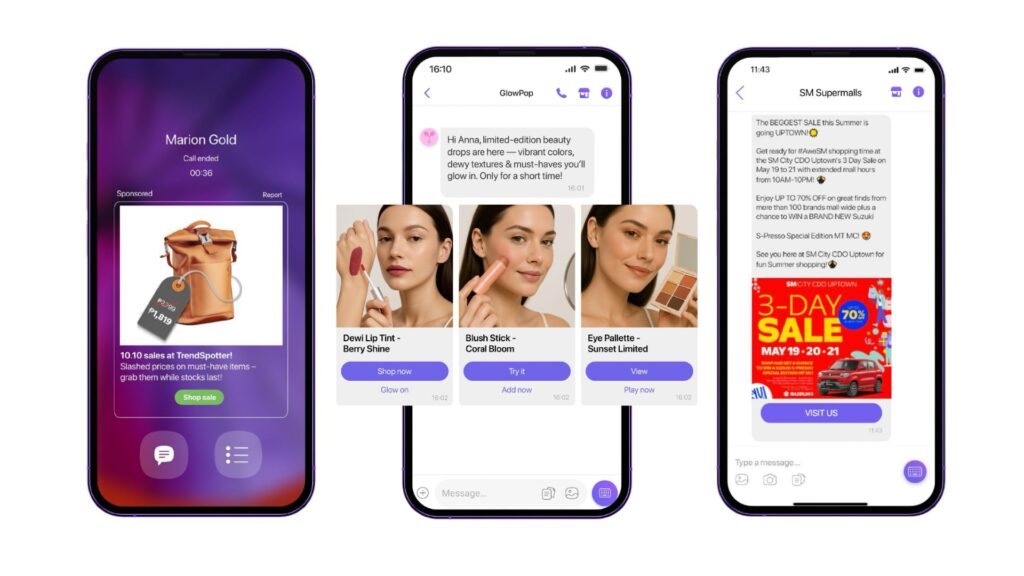 Αύξηση επισκεψιμότητας σε φυσικά καταστήματα με online προωθητικές ενέργειες. Μία αλυσίδα εμπορικών κέντρων, η SM Supermalls, χρησιμοποίησε επαγγελματικά μηνύματα Viber για να προσεγγίσει πελάτες σε ακτίνα 10 χλμ., προωθώντας τριήμερη καλοκαιρινή εκπτωτική εκδήλωση σε ένα από τα καταστήματά της. Χάρη στην προηγμένη στόχευση, εξασφάλισε 60% ποσοστό ανοίγματος και 10% αύξηση επισκεψιμότητας κατά την περίοδο των εκπτώσεων.