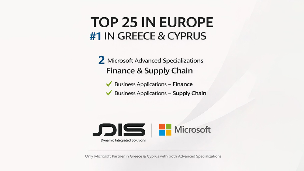 Η DIS – Dynamic Integrated Solutions ανακοινώνει ότι συγκαταλέγεται στους Top 25 Microsoft Partners στην Ευρώπη, αποτελώντας παράλληλα την πρώτη και μοναδική εταιρεία σε Ελλάδα και Κύπρο που διαθέτει και τα δύο Microsoft Advanced Specializations στα Business Applications – Finance και Business Applications – Supply Chain.