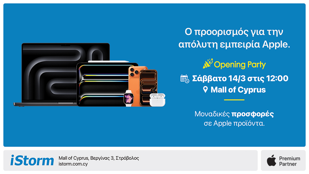 Η iStorm σας προσκαλεί το Σάββατο 14 Μαρτίου, στις 12:00 στα εγκαίνια του πρώτου Apple Premium Partner Store στο Εμπορικό Κέντρο Mall of Cyprus στη Λευκωσία, για να ανακαλύψετε τον απόλυτο Apple προορισμό.
